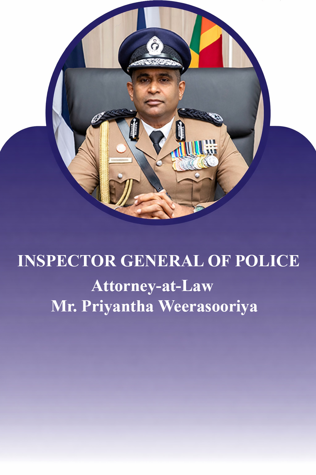 The Inspector General of Police (IGP) is the professional head of the Sri Lanka Police. They are the most senior police officer in Sri Lanka and oversees all police personnel throughout the country. The IGP reports to the Minister of Law and Order, when the Police Service is under the Ministry of Law and Order as it is currently.